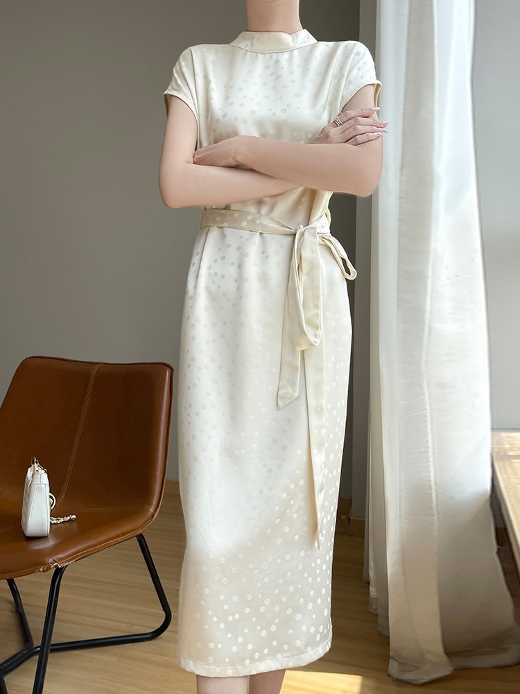 连衣裙缎面高级感波点半高领醋酸连衣裙女短袖桑蚕丝印花波点长裙
