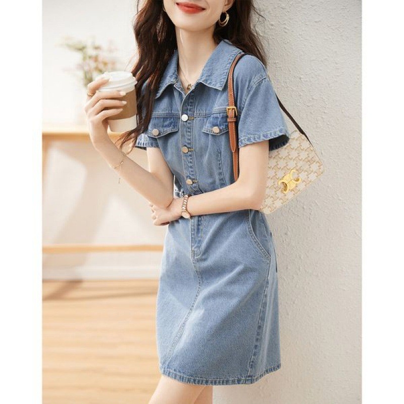 2024夏季新款韩版口袋纽扣设计感收腰显瘦时尚休闲牛仔连衣裙子潮
